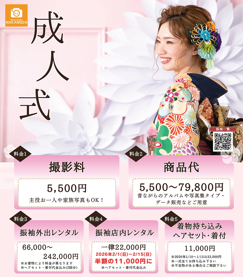 2026年・2027年に成人式を迎えられる方のご予約承ります 2月前半は半額キャンペーン 料金4の22,000円が半額の11,000円に |