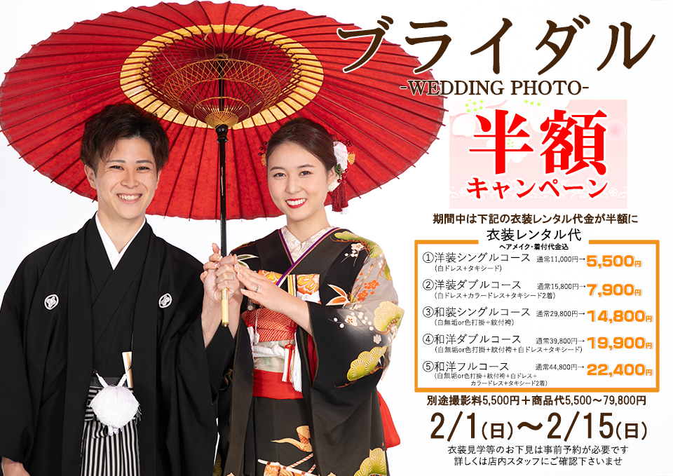 | ※土日祝日もアップ料金なし! ※上記価格には衣装レンタル代・美容・着付け代が含まれております(撮影料・商品代別途要) ※オプションをご利用のお客様は事前に店頭へご来店の上、予約金として全額先に頂戴いたします ※ご予約後のお客様都合による予約金の返金は予約日からの日数にかかわらずいたしかねます ※お下見の際は事前に電話連絡の上ご来店をお願い致します ※店舗スペースの関係上ブライダルのみ常時店頭に展示しておりませんので、予め衣装ギャラリーにて候補をいくつかお下見日の前日12時までにご連絡下さいませ ※男性の方は黒の靴下をご持参下さいませ ※結婚指輪をお忘れなく! ※ブライダル撮影はお2人のみの写真を必ずご購入いただいております(お子様との家族写真やご両親との集合写真のみでのご利用はいただけません) |
