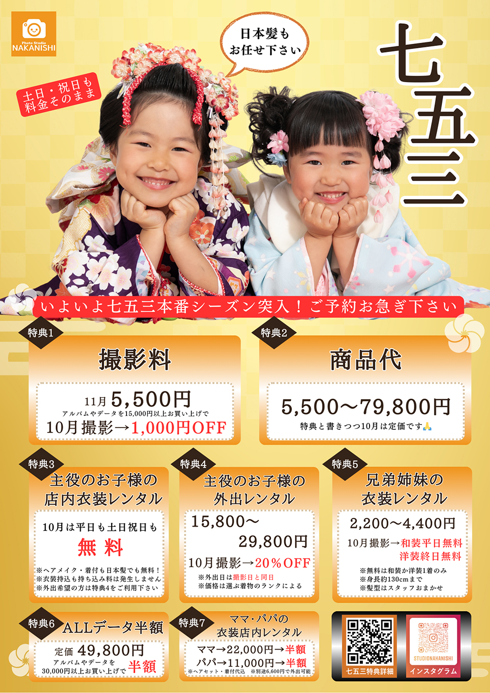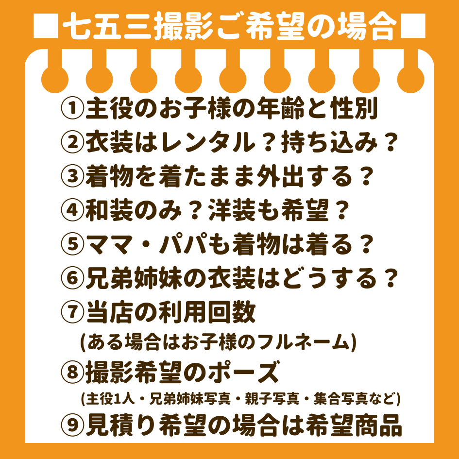 七五三本番シーズン突入 10月は11月よりもオトク ![]() (家族写真のみ・兄弟姉妹写真のみのご購入希望の場合は適用されません) 11月料金はこちら ![]() ![]() ![]() ![]() 衣装選びにかかる時間はお客様により個人差がございますので、待ち時間対策として撮影日当日ではなく事前に決めさせていただいております ホームページよりお選びいただくか、ご来店(要事前予約)による衣装選びが可能です |