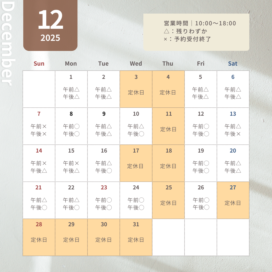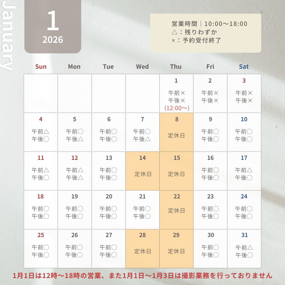 | ●予約状況● 12月12日(金)時点 現在2026年3月31日撮影分まで予約可能 ◯や△の場合でも美容・着付の有無によりお入りいただけない場合がございます (女の子やママなど女性のお支度がある場合は特にお急ぎ下さいませ) ●ご予約について● お問い合わせはLINEからも可能ですが、正式なご予約はお電話(06-6673-2728)にてお願いしております。やむを得ない事情でLINEでのやり取りをご希望される場合はその旨をお伝え下さい。なお仮予約は受け付けておりませんので、LINEからの場合はすべての確認事項のやり取りが終了した時点での空き日時を押さえさせていただきます。 ![]() |