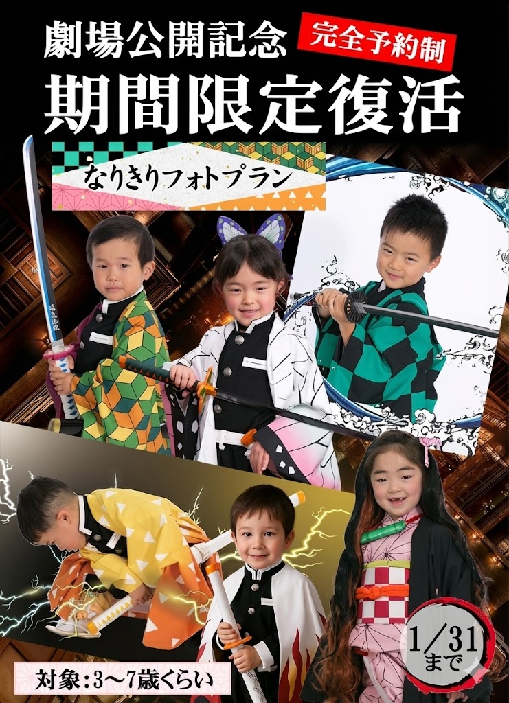 ![]() 2021年に期間限定で行った人気プランが復活 2026年1/4(日)~1/31(土)まで ![]() ※撮影3日前までに要予約 [ご利用可能キャラクター] (ご予約時にお子さまの年齢・性別と希望キャラクターをお伝え下さい) ![]() |